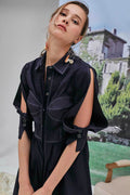 A classic midi length shirt dress with modern contrast bustier detailing and oval slit opening on both sleeves. Model is wearing size S.