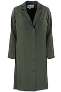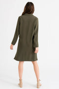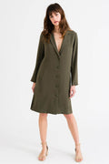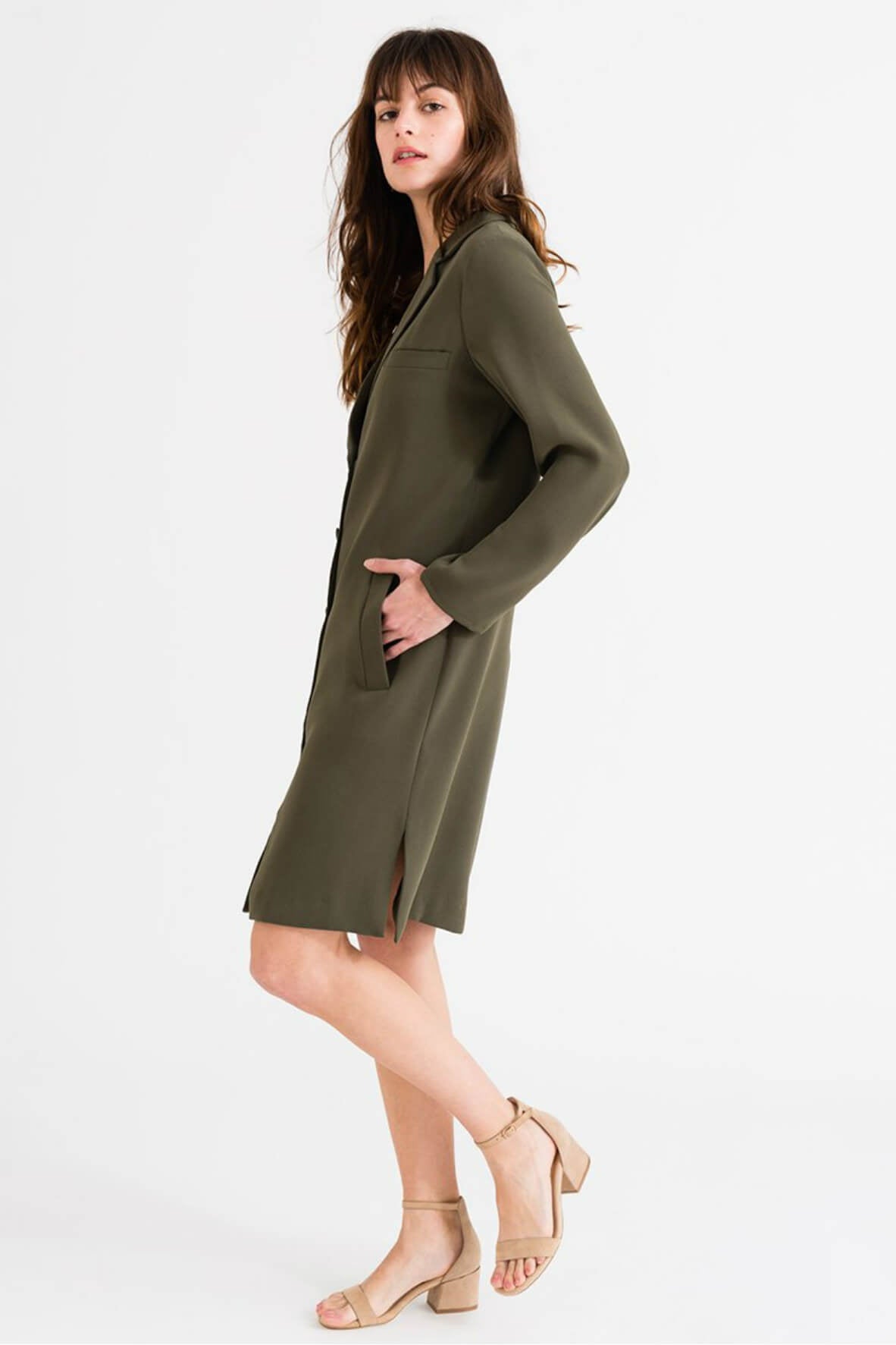 A sophisticated, silky blazer dress that can be worn in many different ways. Wear it as a dress or light jacket, the low cut and button down piece comes in a relaxed silhouette and hits right below the knee. The deep olive color also makes it perfect for transition weather from winter to spring.