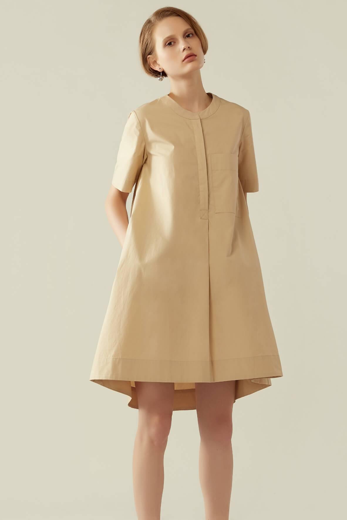 This trapeze silhouette short-sleeve shirt dress is made from smooth cotton poplin with a slight stretch. It is completed with in-seam side pockets, band collar and, concealed placket with tonal buttons. Designed with a back yoke with curved seam and a subtle dip hemline.