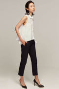Easy-breezy, fresh and spritely. A sleeveless, button-down collared top that you will reach for all the time. Pair with tailored pants for a crisp office look or with your favourite pair of denims for the weekend. Overlaps in the front with ample allowance with its flit-&-flare construction. Cut in a soft twill for gentler drapes. Material is softer and less structured than shown.