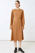 The knee length dress has open cuffs, the sleeve gathering with pleats, keyhole opening at back and rounded neckline. Wear it with your heels or boots and get on to a fabulous day.