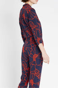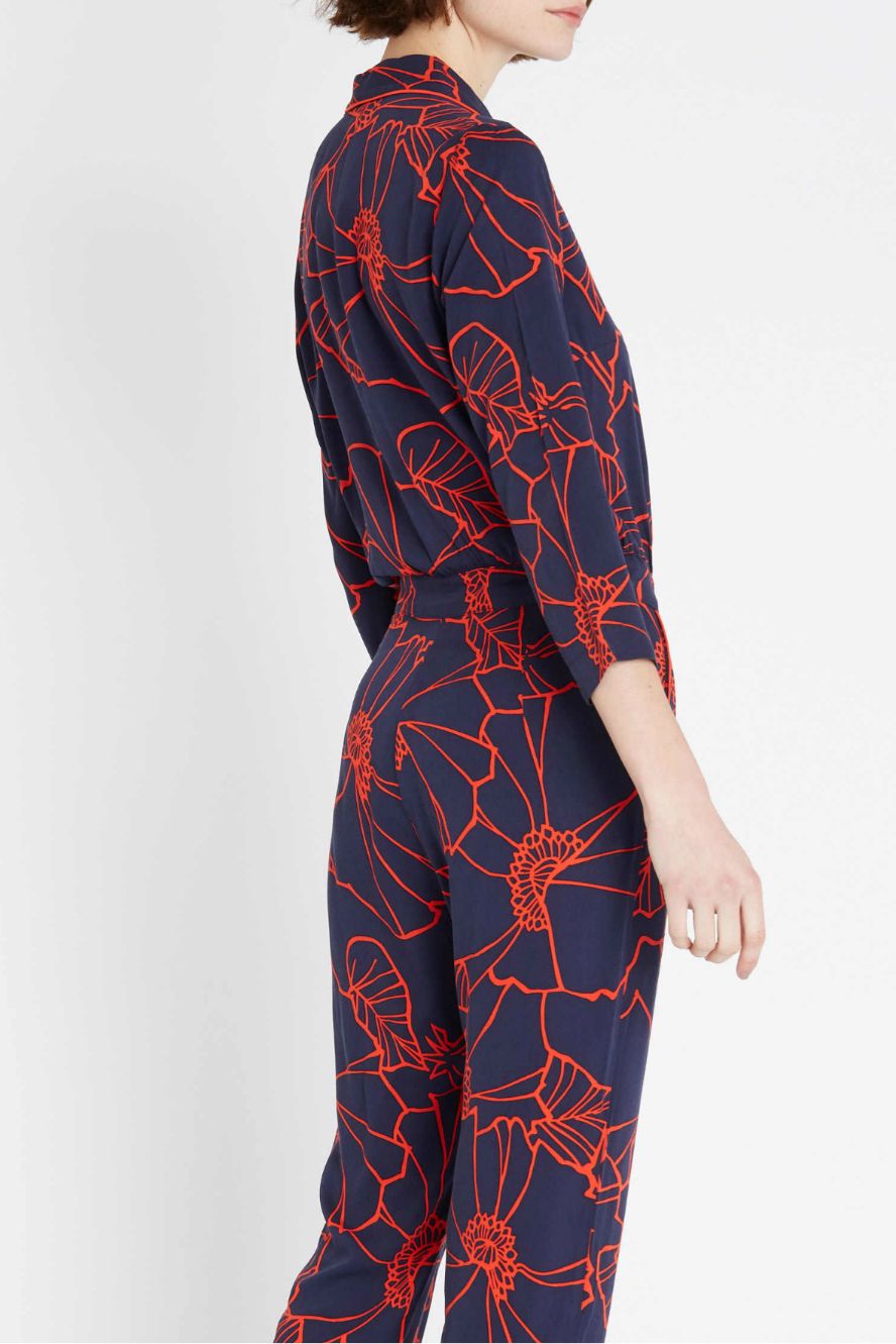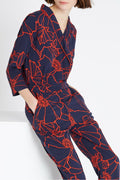 An abstract floral printed jumpsuit with a v neckline, fitted waist and front side pockets.
