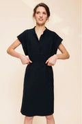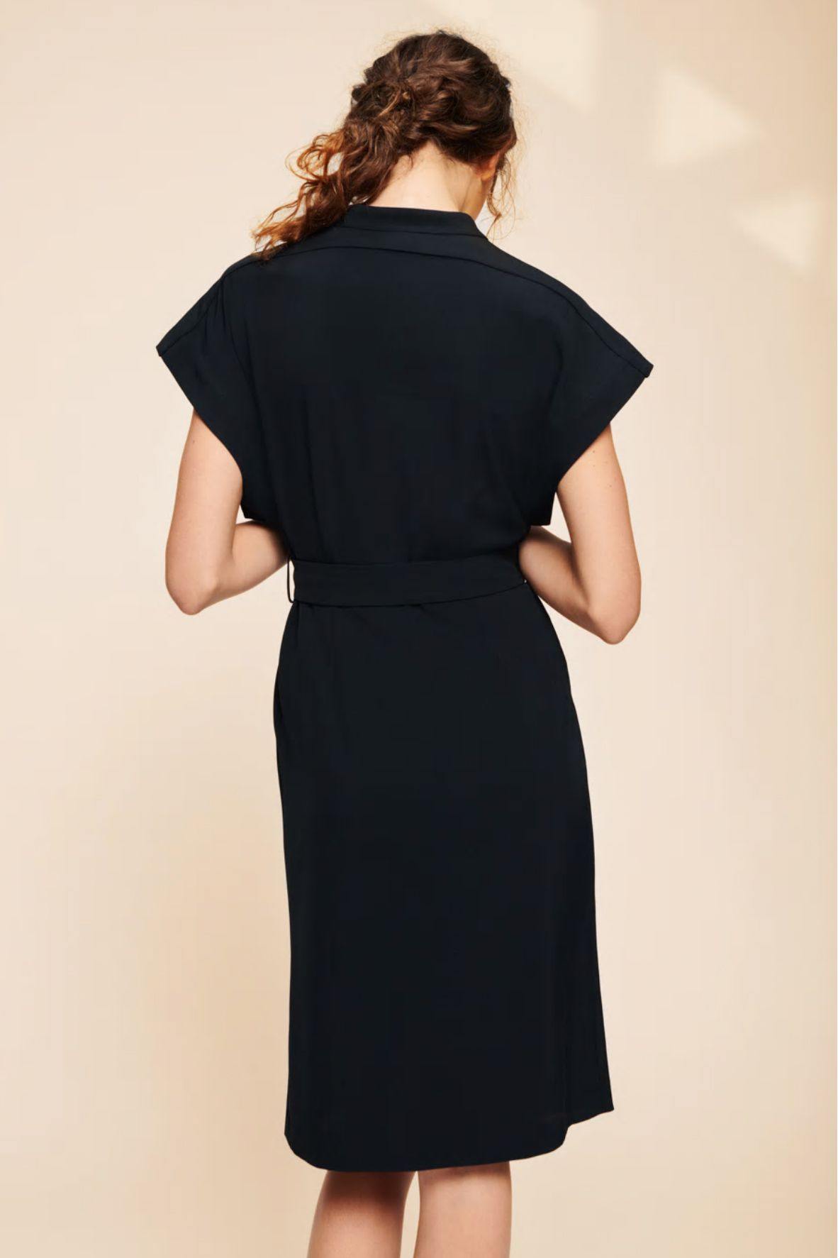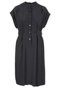This black knee length dress is made of flowy twill. Its Mao collar and button line on the front bring originality to the item. Short sleeves with pleated details on the shoulder and half-belt fixed with buttons at the waist.