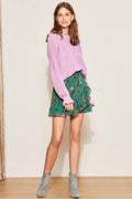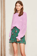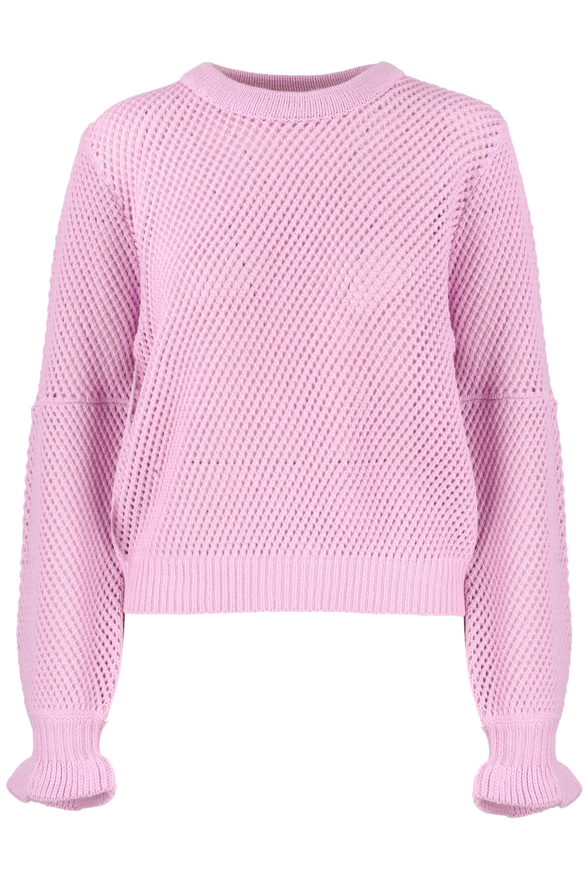 The knitted sweater/jumper is a boxy fit, with long fancy sleeves and ribbed neck, hem and sleeve hem.
