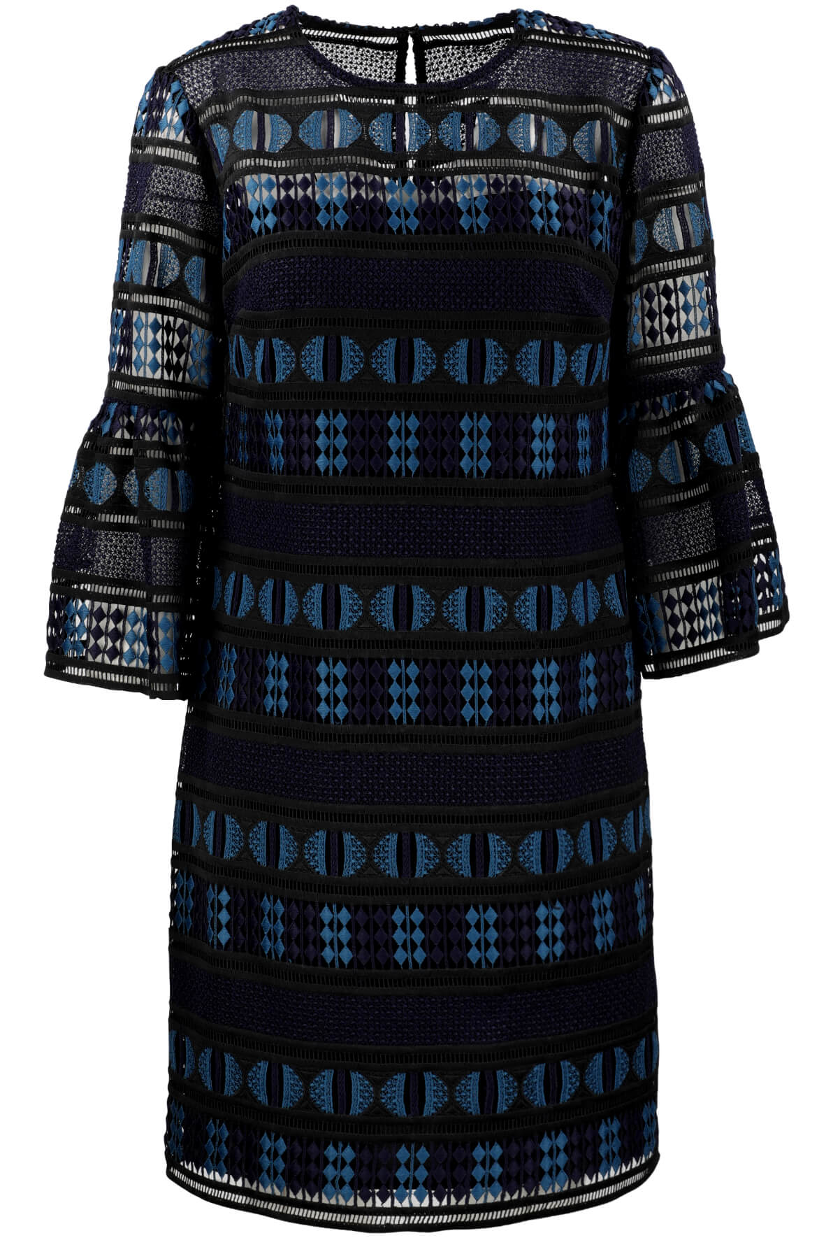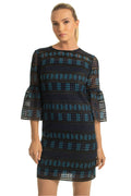 The Trina Turk mini lace dress features, crew neckline, 3/4 length bell sleeves, and zipper closure.