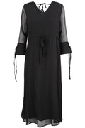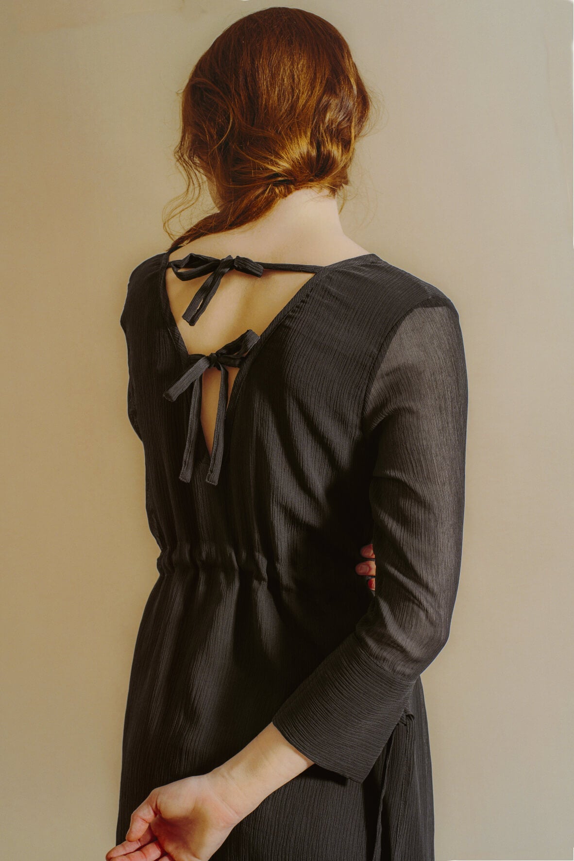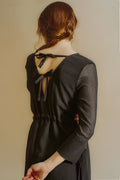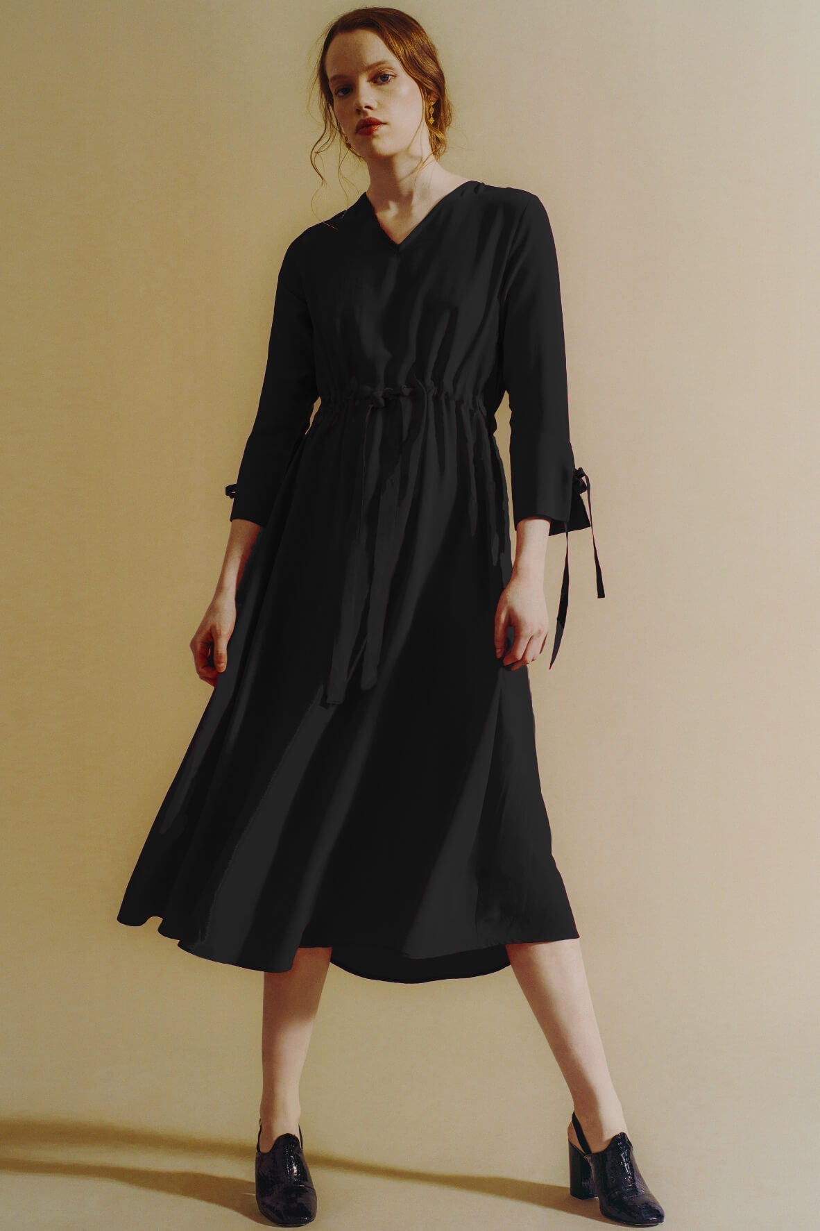 This silk, mid-length dress cinches at the waist and features tie details on the sleeves and back. The easy fit and quarter-length sleeves make it the perfect fall dress on its own.