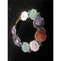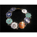The piece is stunning! It has enamel painted, multi-color, octagon links in white, red, yellow, turquoise blue, and a deep, indigo blue. There is different design in the center of each octagonal link of either a boat, adorned elephant or Hindu god or goddess each block of color that is engraved to enhance the detailing. The piece is unusual- it is a geometric design that seems to pay respect to the Ganges river, with both cows and Hindu images, as opposed to the usual goddess theme Siam sterling jewelry is known for depicting.