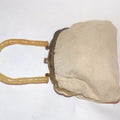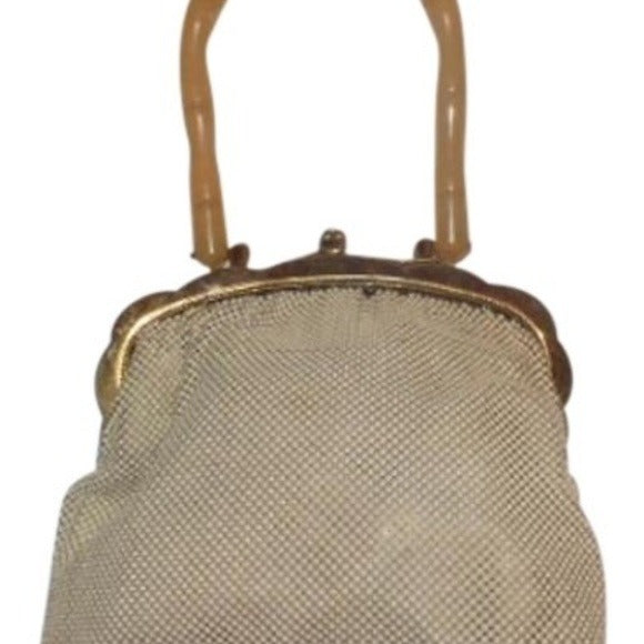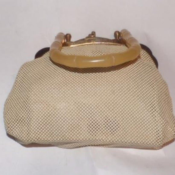 Art Deco, Whiting and Davis, cream enamel mesh purse with a carved bamboo look, translucent apple juice Bakelite handle