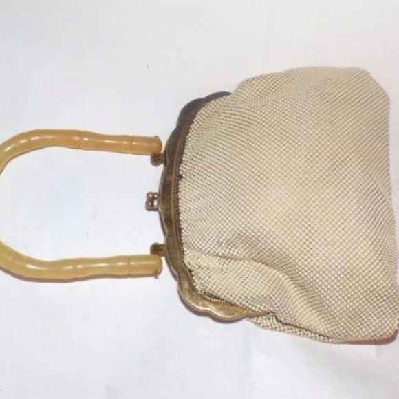 Vintage Art Deco, Whiting and Davis, cream enamel mesh purse with brass, hinged, kiss closure top and carved bamboo look, translucent apple juice Bakelite handle!