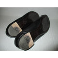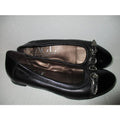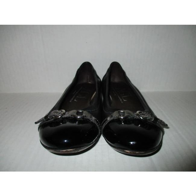 Delicious soft black leather ballet flats have black 1-3/4 inch patent toe tips with pewter 3/8 inch wide strap and hardware. Signature insoles intact. Made in Italy. EU 37/US 7. Please refer to online size conversion tables. All measurement are approximate.
