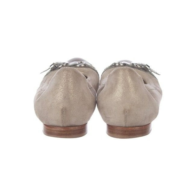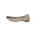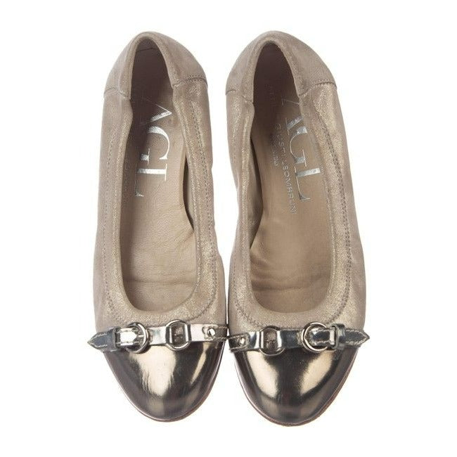 Beige Taupe Suede AGL round-toe flats with metallic cap toes and stacked 1/2 inch heels. Buckle toe embellishment. Refer to online size conversion charts. All measurements are approximate.