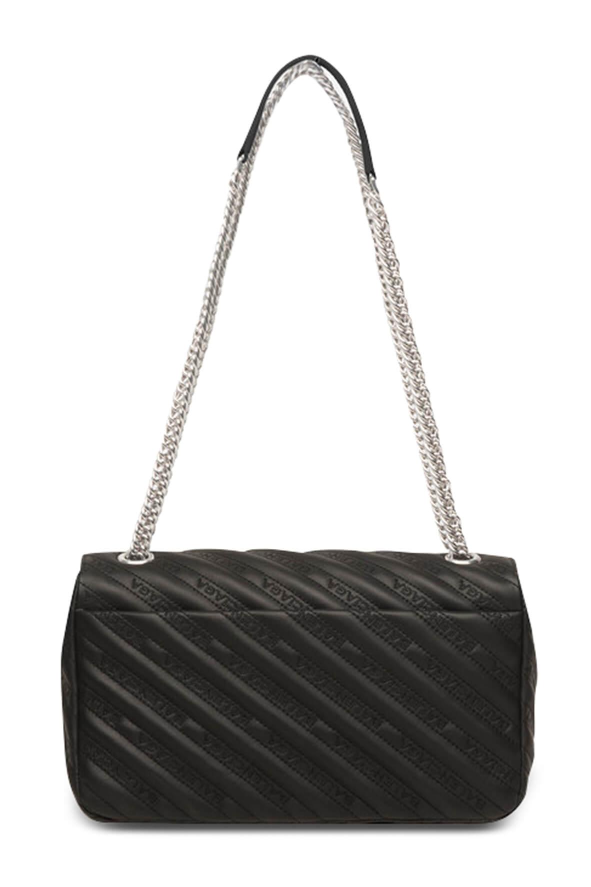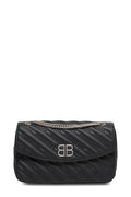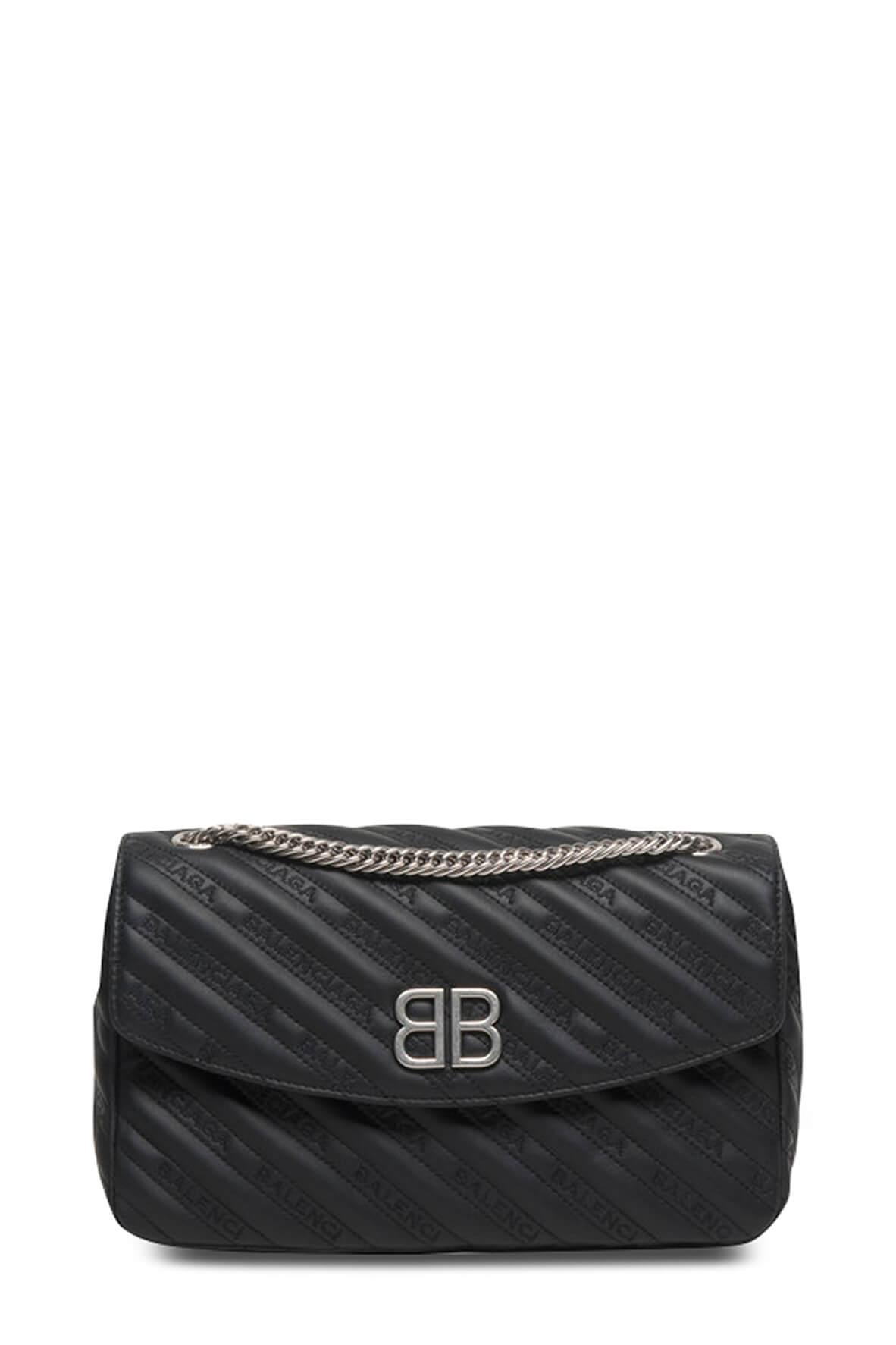 Black calf leather Medium BB Chain Shoulder Bag featuring a foldover top with magnetic closure, a main internal compartment, a chain and leather strap, a front logo plaque and diagonal stripes.
