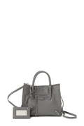 The bag features rolled leather top handles, belts with silver buckles and studs, and an optional adjustable shoulder strap with silver clasps. The top is open to a grey interior with a zipper pocket and a removable mirror.