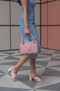 This highly structured tote is constructed of grained calfskin leather in light pink.The tote features rolled leather top handles and large magnetic buckle closure with gold hardware. The interior is lined with house check fabric and features zipper and one flat pocket.