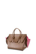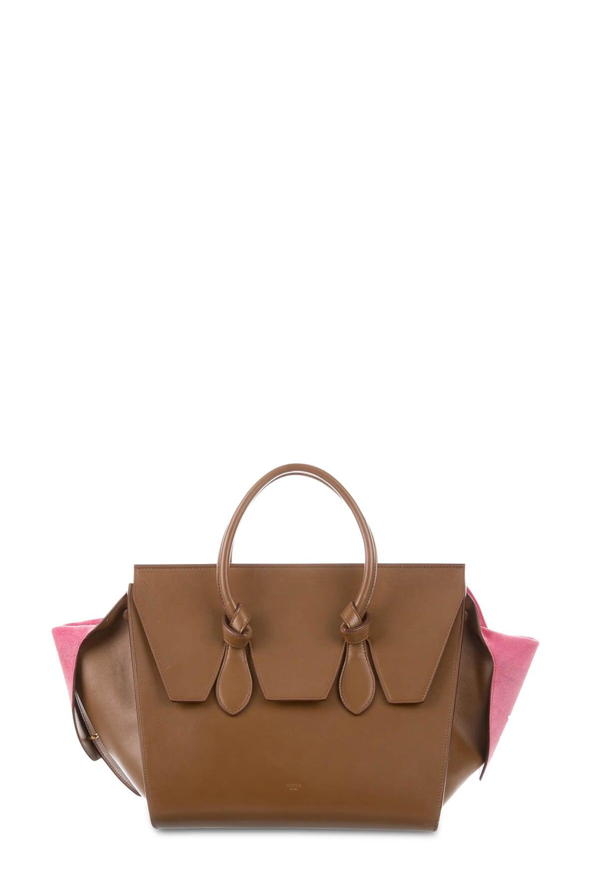This stunning tote features "ties" at the base of each rigid handle with a winged structured shape. The tote can be with the flap tucked in or exposed on the outside for a modern look.