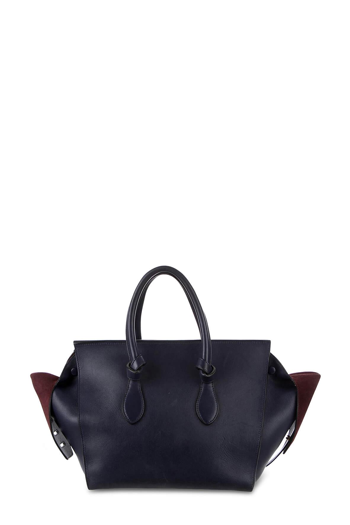 This stunning tote features "ties" at the base of each rigid handle with a winged structured shape. The tote can be with the flap tucked in or exposed on the outside for a modern look.