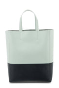 Mint green and evergreen grained calfskin leather Céline Small Bicolor Vertical Cabas tote with gold-tone hardware, dual flat top handles, single adjustable flat shoulder strap, foil-stamped logo accent at front, creme suede lining, single zip pocket at interior wall and open top.