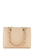 This stylish handbag is crafted of diamond-quilted caviar leather in beige. This shoulder tote features a large quilted Chanel CC logo on the front, a flat pocket on the back and polished gold hardware. The top is open to a partitioned beige satin interior with zipper and patch pockets. This is an excellent tote for everyday use, from Chanel!