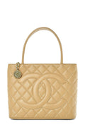 This classic tote is crafted of pebbled calfskin leather in beige. It features looping leather top handles, a matte gold CC medallion zipper pull, diamond quilting and a CC logo patch. The top zipper opens to a matching leather interior with zipper and patch pockets.