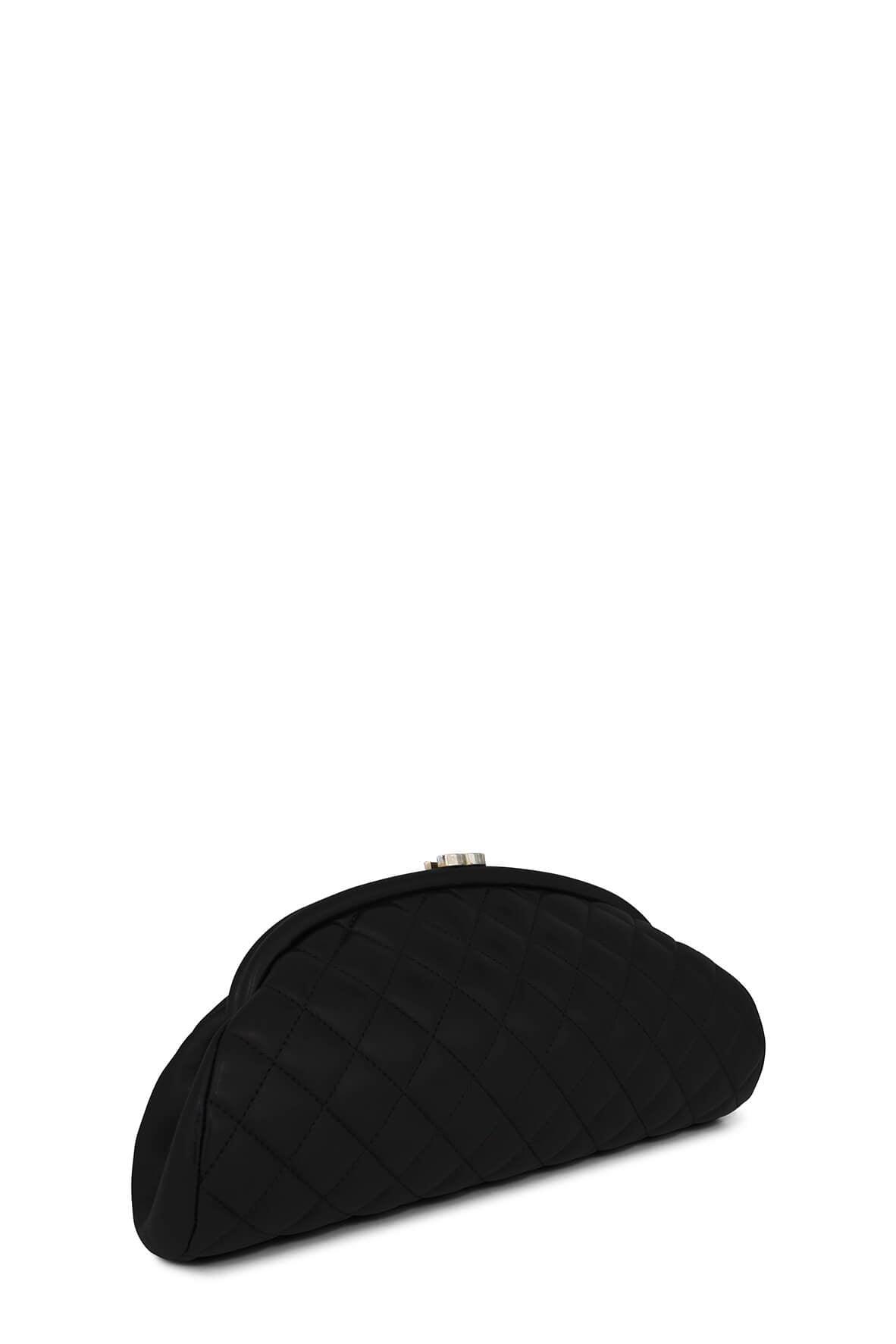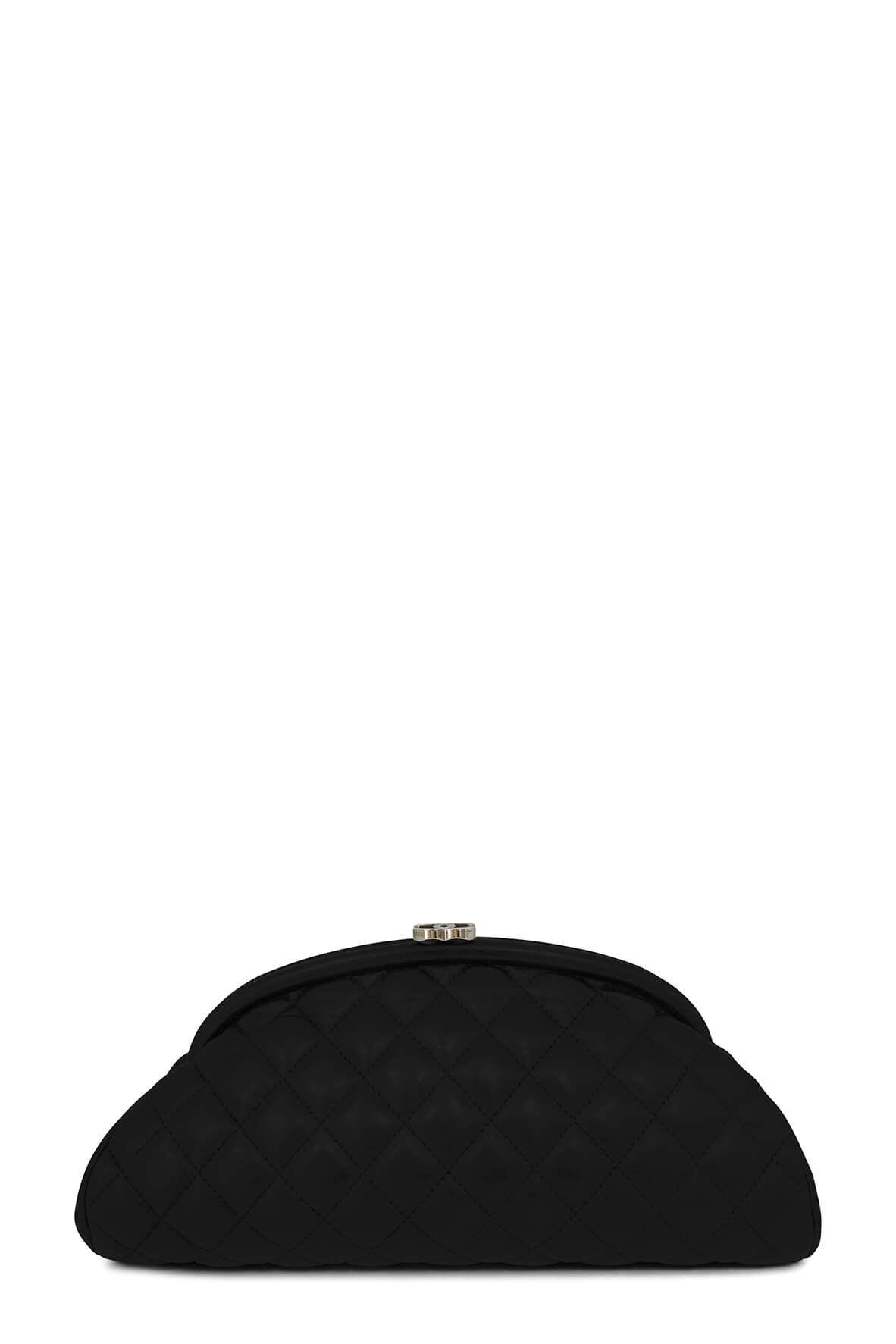 Black quilted Chanel Timeless Clutch with silver-tone hardware, black leather trim, black leather lining, single pocket with zip closure at interior wall and CC push-lock closure at top.