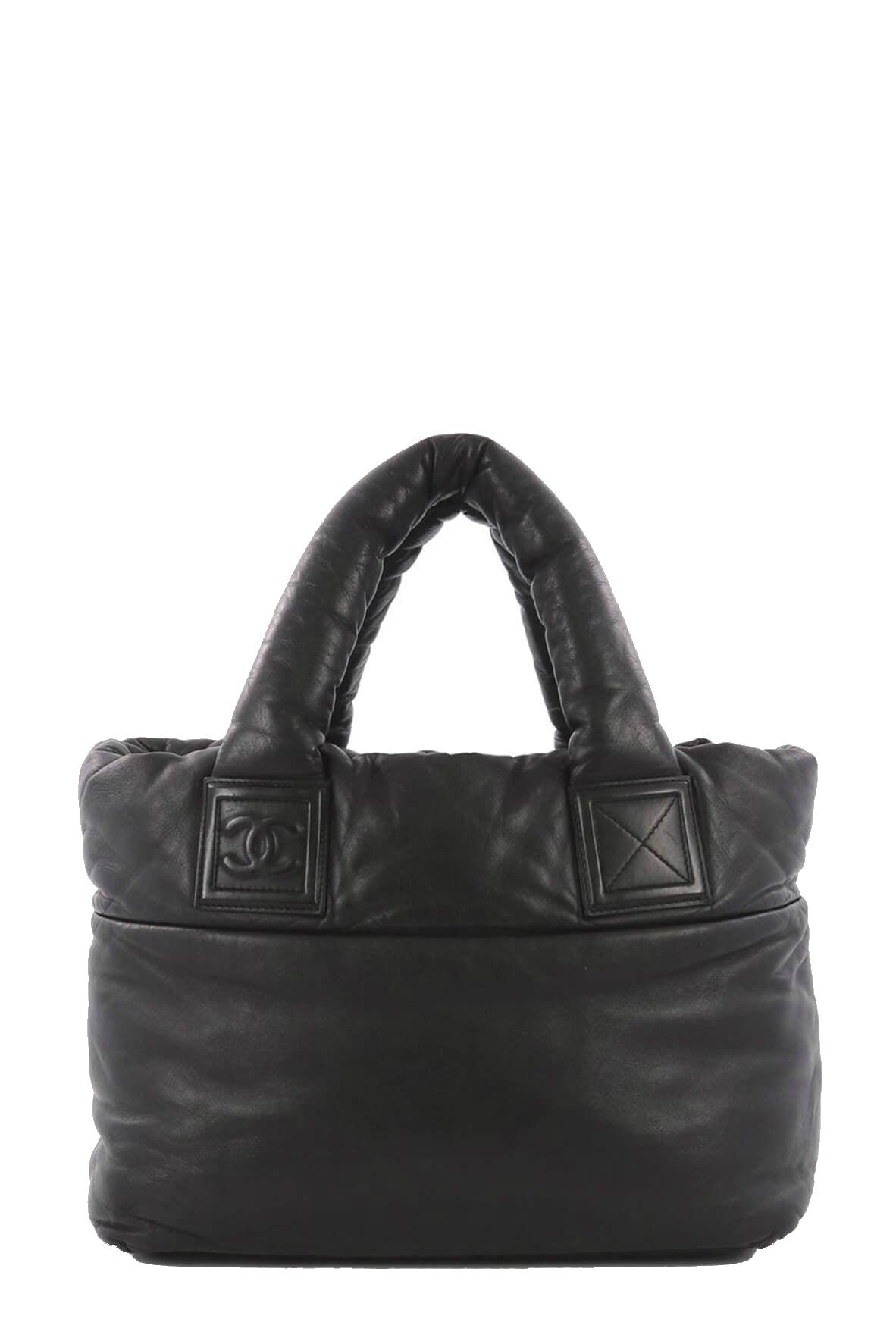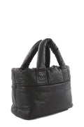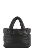 This sophisticated tote is structured of soft black lambskin, The reversible side is black and burgundy lambskin leather with diamond quilting and a zippered pocket. The bag features padded top handles.