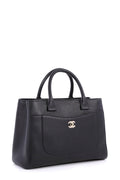 The Chanel Small Neo Executive Shopping Tote is the ideal everyday accessory for the modern woman. Crafted from beautiful black leather, this functional tote features dual-rolled leather handles, front pocket with CC turn-lock closure, exterior back slip pocket, protective base studs, and gold-tone hardware accents. Its magnetic snap closure opens to a burgundy fabric-lined interior divided into two compartments with a center zip compartment and with side zip and slip pockets perfect for housing bare essentials. The bag's detachable strap allows it to be longer on the body for added versatility.