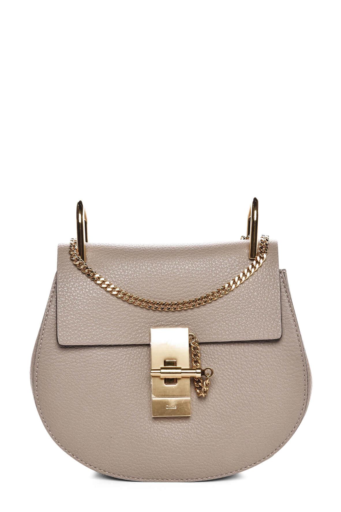 This chic cross body is crafted of finely grained leather in grey. The bag has a bijoux cross body silver chain shoulder strap and a facing flap with a gold turn lock and pin closure. The flap opens to a beige suede interior with a hanging patch pocket. This cross-body bag is ideal for day or evening wear, from Chloe!