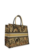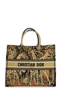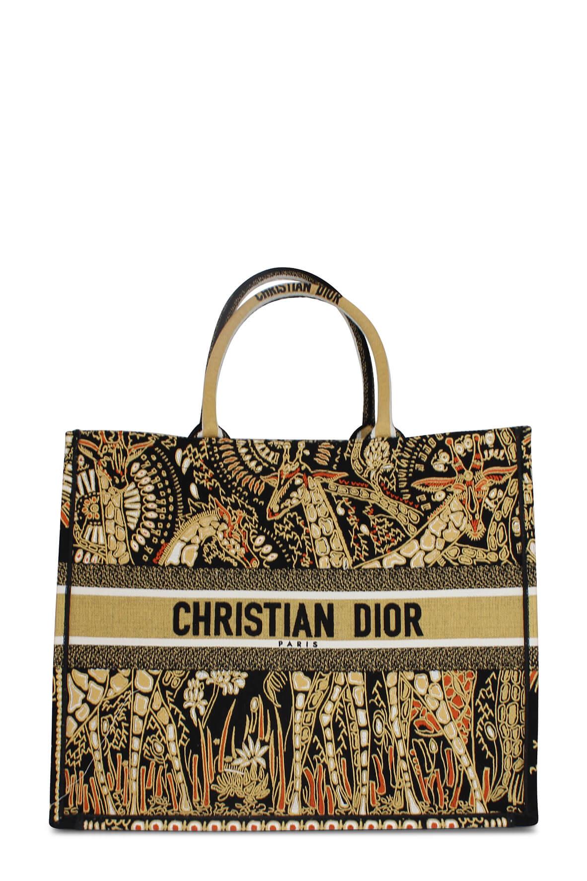This colorful tote is finely crafted of embroidered canvas with bold safari graphics. The bag features matching canvas rolled handles, with the CHRISTIAN DIOR logo embroidered across the front. The bag opens to a spacious fabric interior.