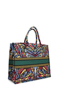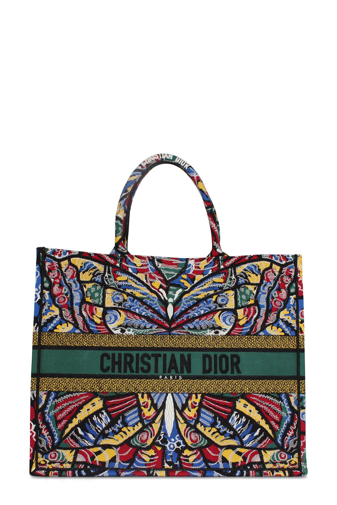 Crimson and multicolor butterfly embroidered canvas Christian Dior Book tote with dual rolled top handles, logo embroidery at front face, tonal canvas interior and open top.