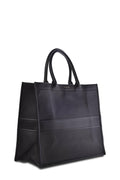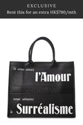 This stylish tote is finely crafted of calfskin leather in black. The bag features rolled leather handles, with an embossed CHRISTIAN DIOR logo and a printed Surrealism slogan on the front. The bag opens to a spacious microfiber interior.