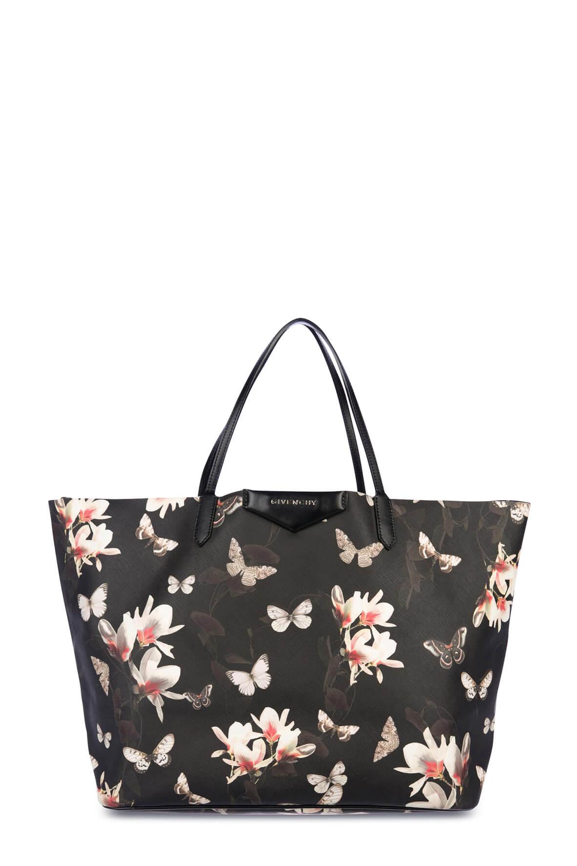 Givenchy Antigona Floral Print Tote Whimsical crafted in a coated canvas with a abstract floral print all over. Designed with signature Antigona envelope fold detail with raised metal logo. Features black leather double straps and a removable matching pouch with zip closure.