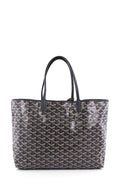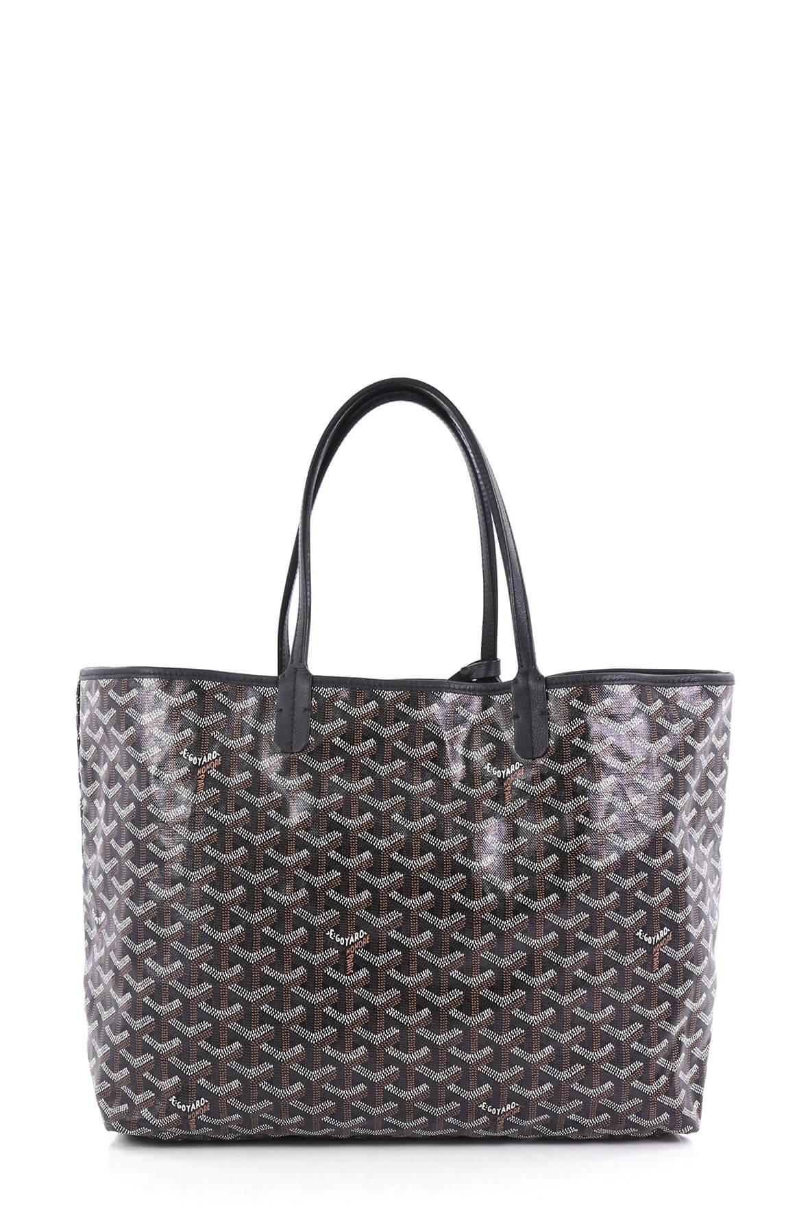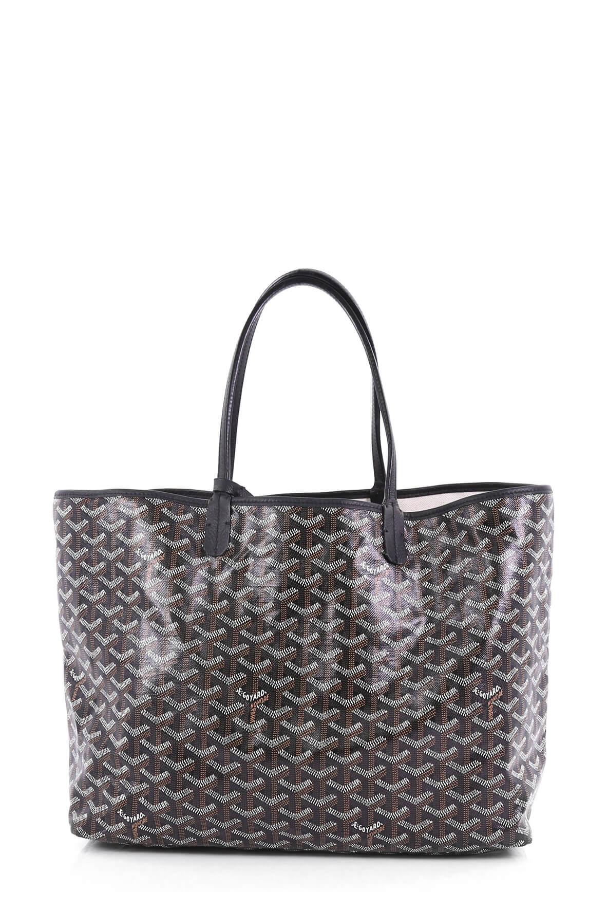 This Goyard St. Louis Tote Coated Canvas PM, crafted from black coated canvas, features dual slim leather handles, leather trim, and silver-tone hardware. Its wide open top showcases a beige canvas interior.