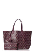 This stylish tote is crafted of coated canvas with the classic Goyard chevron monogram in burgundy. The bag features leather strap top handles and top border trim. The top is open to a spacious linen interior with a matching pochette.