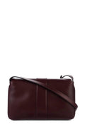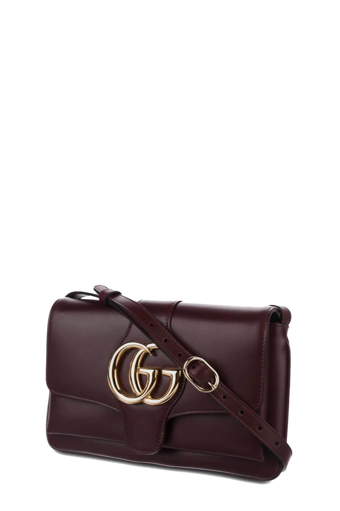 Burgundy smooth leather Gucci Small Arli bag with gold-tone hardware, adjustable flat shoulder strap, logo adornment at front, dual interior compartments, pink grosgrain lining, single zip pocket at interior wall and magnetic snap closure at front flap.