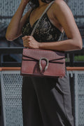 The Dionysus shoulder bag is presented in textured leather in a bordeaux shade, introduced for Pre-Fall 2019. The now defining tiger head closure—a unique detail referencing the Greek god Dionysus, who in myth is said to have crossed the river Tigris on a tiger sent to him by Zeus—is further enhanced with sparkling crystals. The sliding chain strap can be multiple ways, changing between a shoulder and a top handle bag.