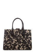 Tan and brown GG Supreme coated canvas Gucci Arabesque tote with antiqued silver-tone hardware, black leather accents, dual rolled top handles, single optional flat shoulder strap with buckle adjustment, caramel suede lining, dual card slots, zip pocket, three interior pockets; one with zip closure and magnetic closure at top.