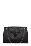 This chic shoulder bag is crafted of fine Gucci GG monogram embossed leather in black. The bag features gold chain shoulder straps with leather shoulders pads and a crossover flap that secures with a horsebit-embellished flap. This opens to a spacious natural fabric interior with zipper and patch pockets.