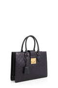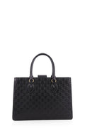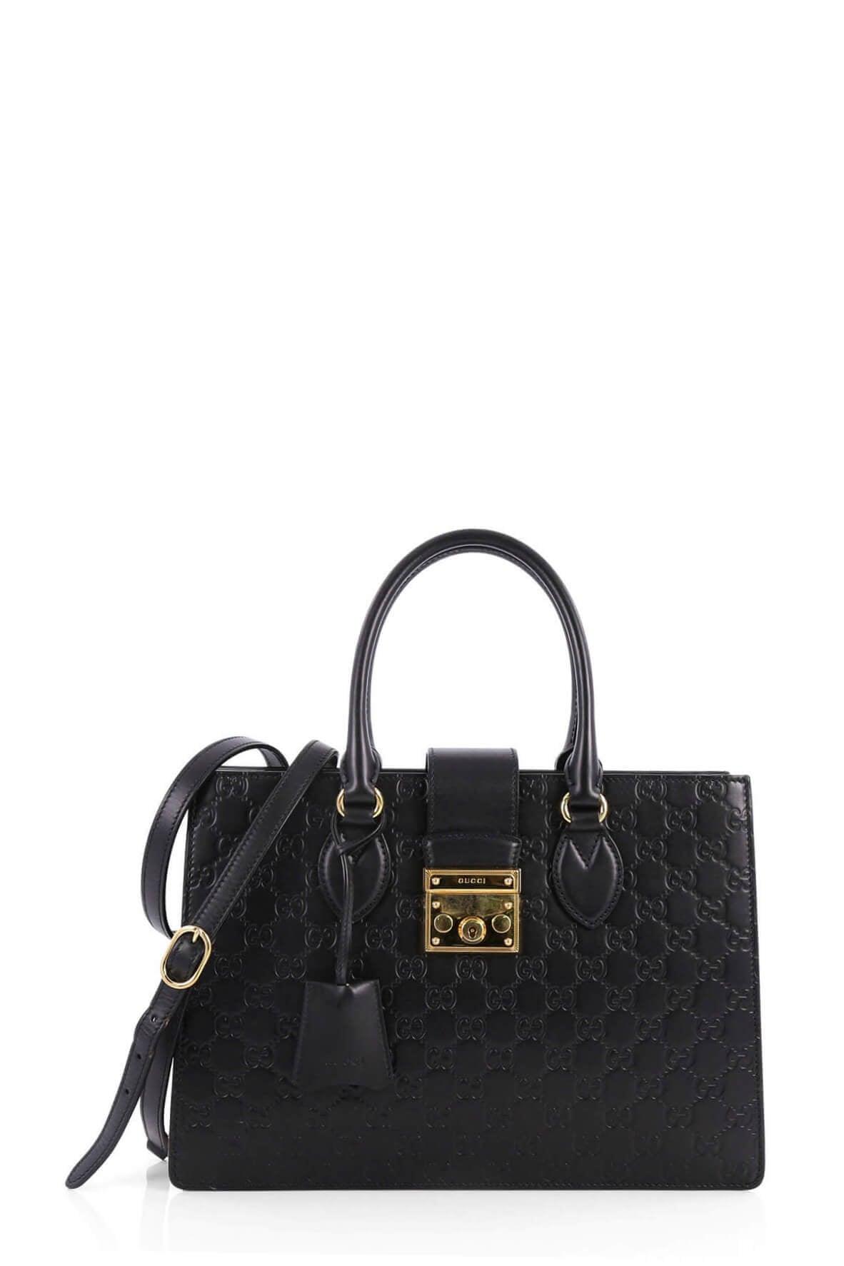 This Gucci Padlock Convertible Tote Guccissima Leather Medium is a classic for Gucci lovers. Crafted in black guccissima leather, this tote features dual-rolled leather handles, structured silohette and gold-tone hardware accents. Its padlock tab closure opens to a nude microfiber-lined interior divided into two compartments with a center zip compartment with side zip and slip pockets perfect for storing your daily essentials. The bag�s detachable strap allows it to be longer on the body for added versatility.