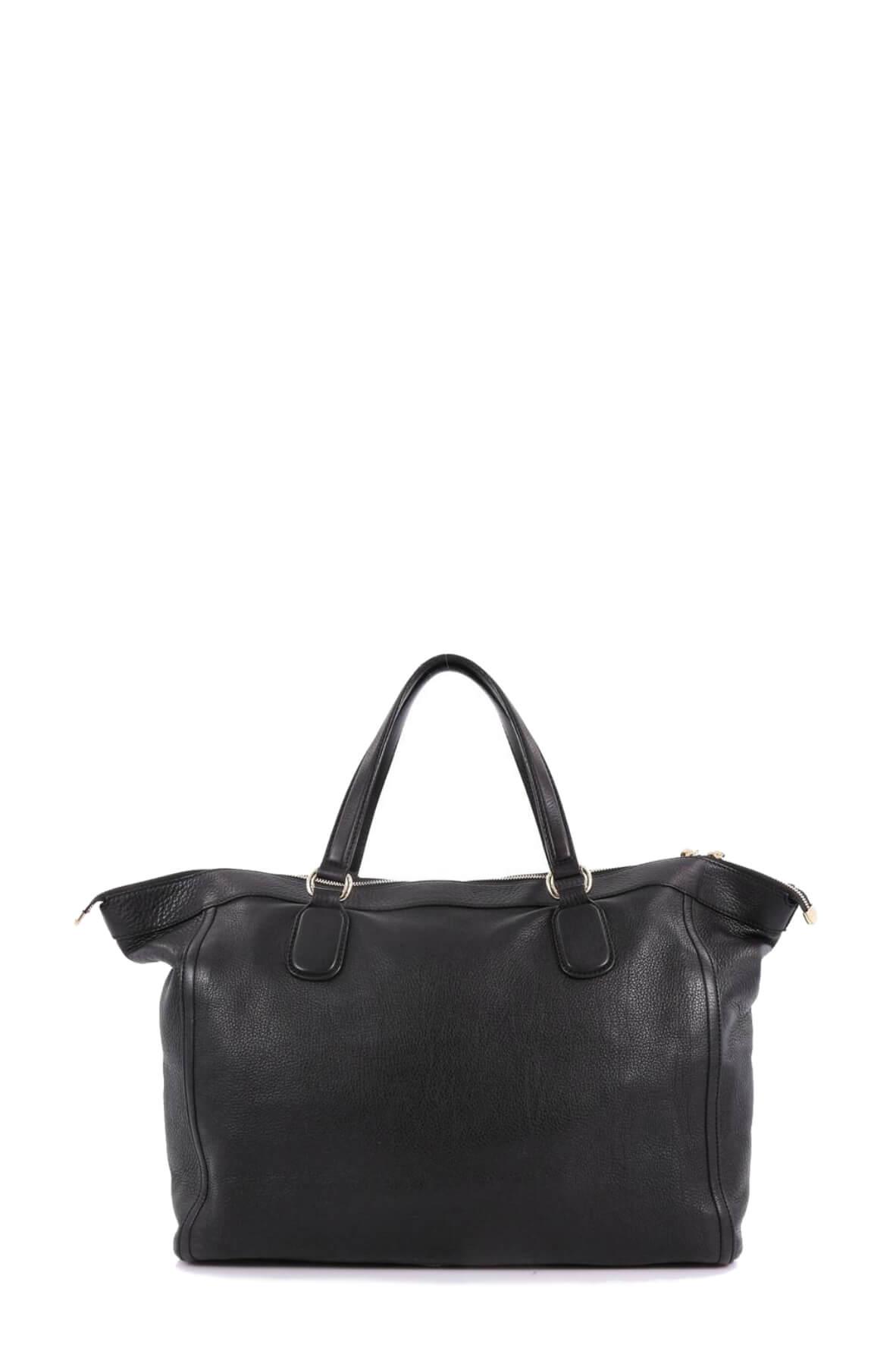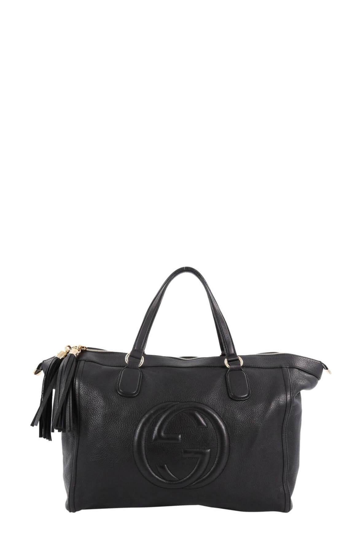 This Gucci Soho Zip Tote Leather Large, crafted in black leather, features dual flat leather handles, stitched interlocking GG logo, and gold-tone hardware. Its zip closure opens to a beige fabric interior with zip and slip pockets.