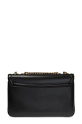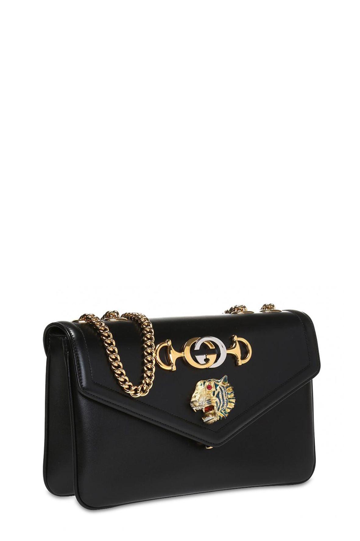 Black 'Rajah' shoulder bag from Gucci. Made of leather. Fastened with snap. Enriched by metal logo and a tiger head application encrusted with crystals. Half-round chain handle. Light pink, lined interior has 1 compartment, 1 slip pocket and 1 zip pocket. Gold-tone and silver-tone metal hardware.