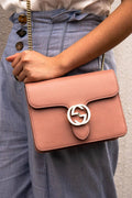 The bag features a waist length chain link shoulder strap in gold and a facing flap with a polished light gold interlocking GG emblem. The flap opens to a partitioned beige fabric interior with a patch pocket. This shoulder bag is perfect for day and evening essentials with the stylish sophistication from Gucci!