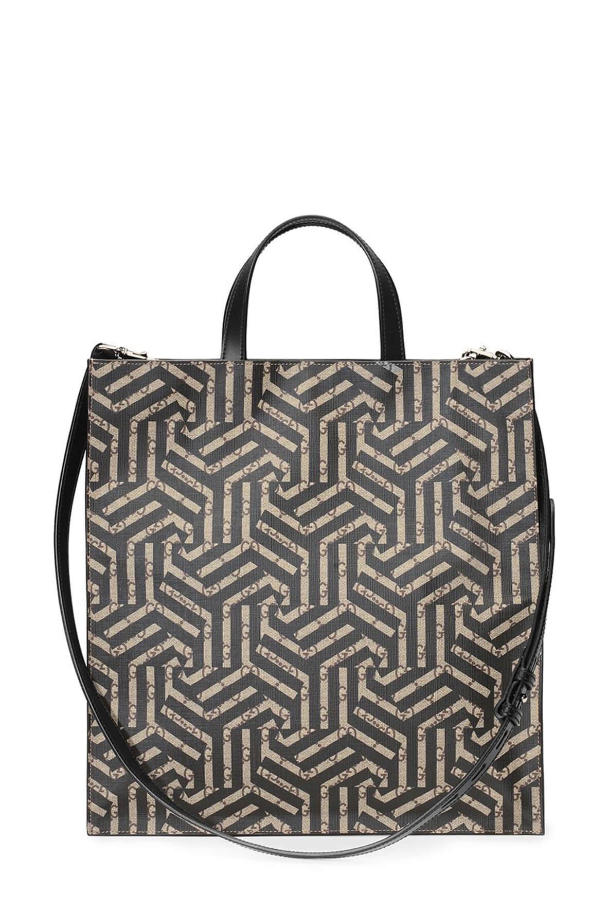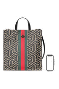 Beige and brown Soft GG coated canvas Gucci Caleido Web Tote with silver-tone hardware, black leather trim, dual flat top handles, optional shoulder strap with buckle adjustment, signature green and red Web print at center, bee accent at front, black suede lining, dual zip pockets at interior walls and magnetic closure at top strap.