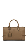 Amazona 36 Bag from Loewe is crafted from brown grained leather designed with gold-tone hardware, metal protective feet at the base, dual rolled top handles, double top zip closure and anagram logo stamp on the front. The interior is lined in leather featuring a single zip pocket and a slip pocket to the side.