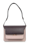 Brown, beige and black 'Trunk' shoulder bag from Marni. Made of bovine leather. Fastened with a metal buckle. Slip pocket at the back. Adjustable shoulder strap. Navy, black and beige lining. 4 compartments and 2 zip pockets inside. Gold-tone metal hardware.