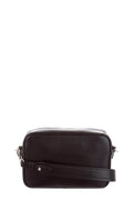 Black leather Prada Banana Logo crossbody bag with silver-tone hardware, print at front face, flat shoulder strap, tonal jacquard lining, dual pockets at interior walls; one with zip closure and zip closure at top opening.