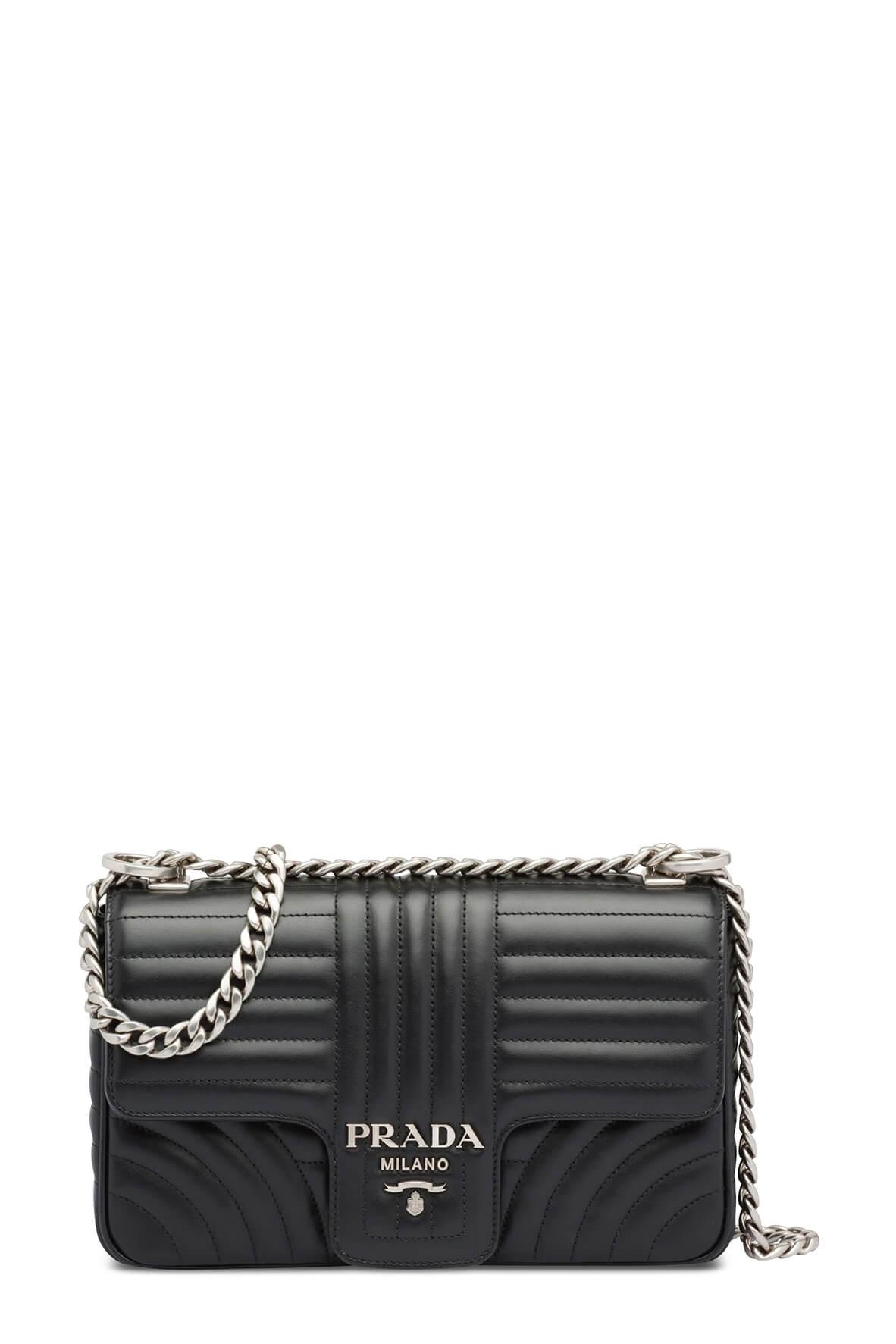 One of the latest additions to the Prada bag family, the Diagramme Medium bag will quickly become a perennial piece in your accessories rotation. Crafted in Italy from black calf leather, this roomy design features trapunto stitching in modern lines that's complemented by the silver hardware. The label's logo lettering is proudly displayed at the flap closure as a testament to this piece's exceptional quality.