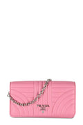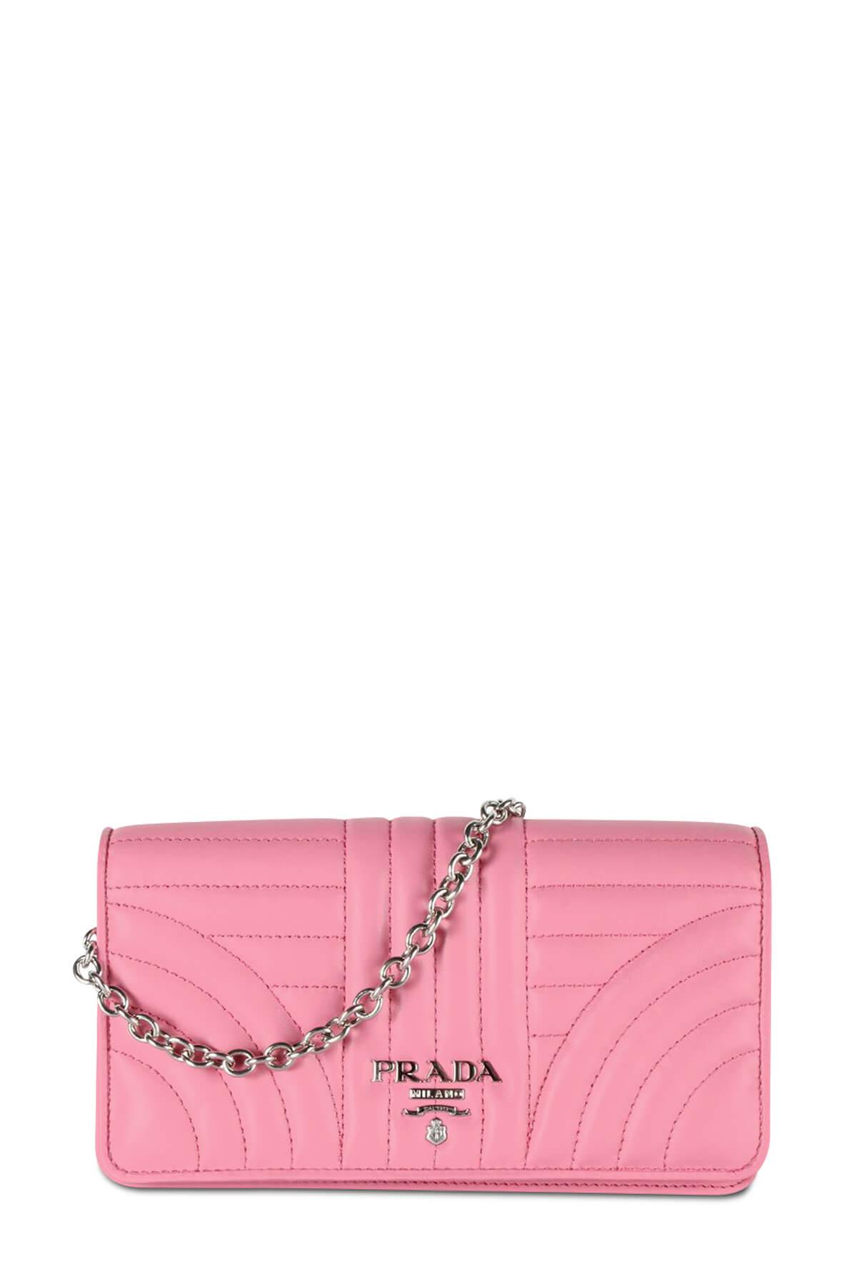 Prada quilted lamb leather small crossbody bag. Silvertone hardware. Removable chain shoulder strap. Flap top with double snap closure.