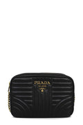 Crafted from soft quilted calf leather, this small camera bag features a removable chain and leather shoulder strap, front metal logo, top zip closure, one inner zipped pocket.