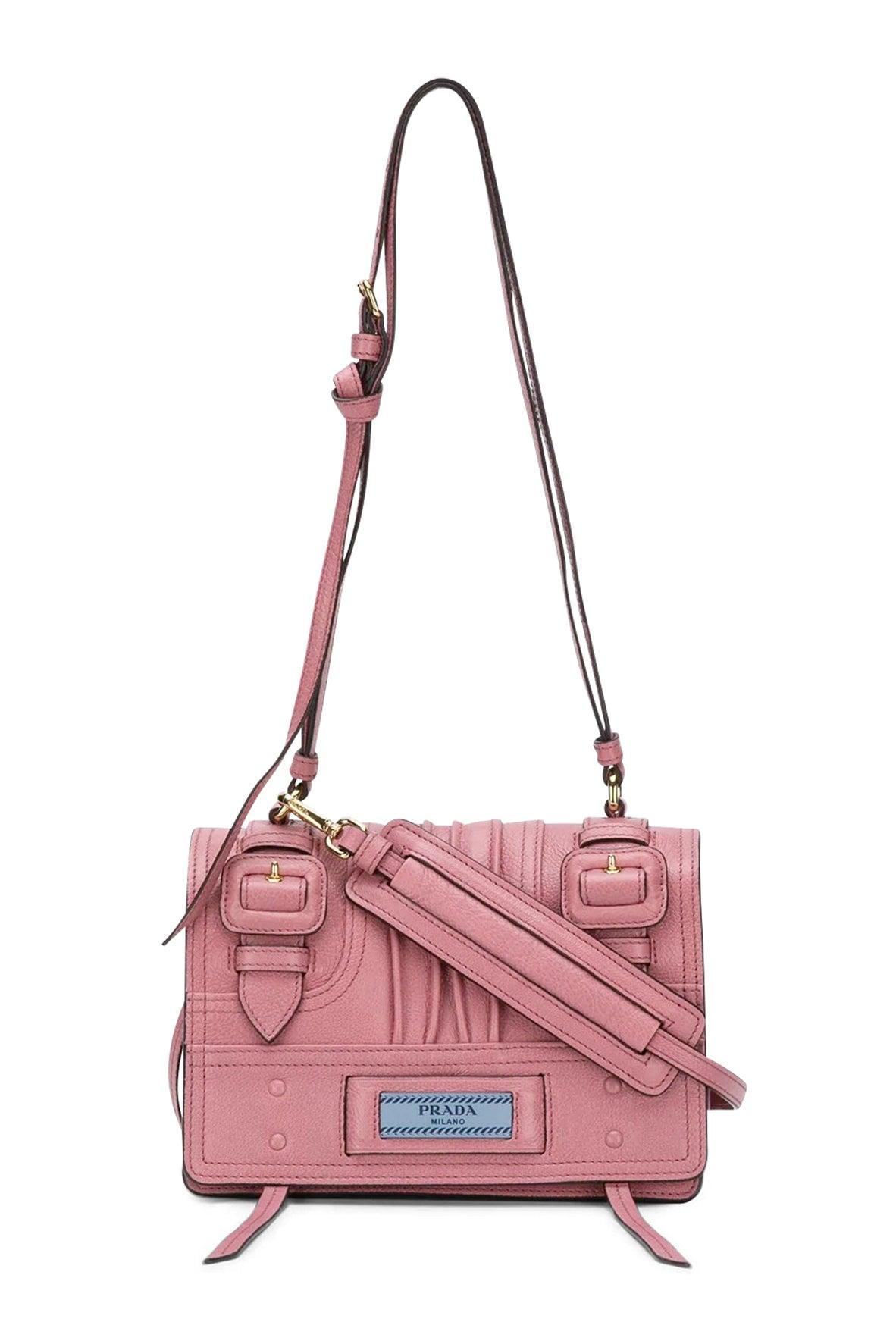 In a lovely small size which expands to the side as laterals are unzipped, the Etiquette crossbody bag is a gem. Created from loto pink calf leather and gold-tone hardware, it features two adjustable shoulder straps, one of them removable. It also has a foldover top with an internal push-lock closure, a main compartment with a logo plaque adorned slip pocket, a front logo patch and unique decorative buckled straps.