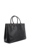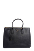 This chic tote is crafted of stylish Saffiano cross grain leather with a classic structure. The bag features rolled leather top handles with brass links. The top is open to a Prada jacquard monogram fabric interior with full zipper pockets on either side. This is an excellent tote, ideal for everyday or evening use, only from Prada!